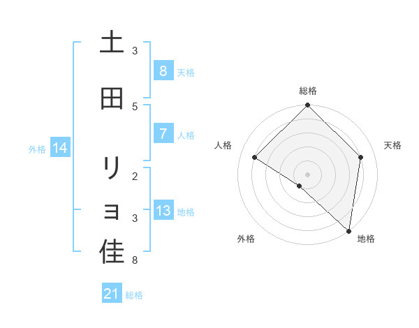 土田 リョ佳さんの総格は21画の5点!