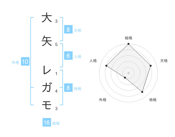 大矢 レガモさんを姓名の画数から五運を鑑定