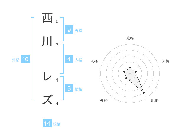 西川 レズさんの総格は14画の1点!