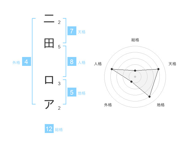 二田 ロアさんの総格は12画の1点!