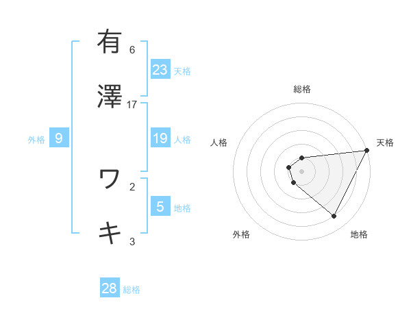 有澤 ワキさんの天格は23画の5点!