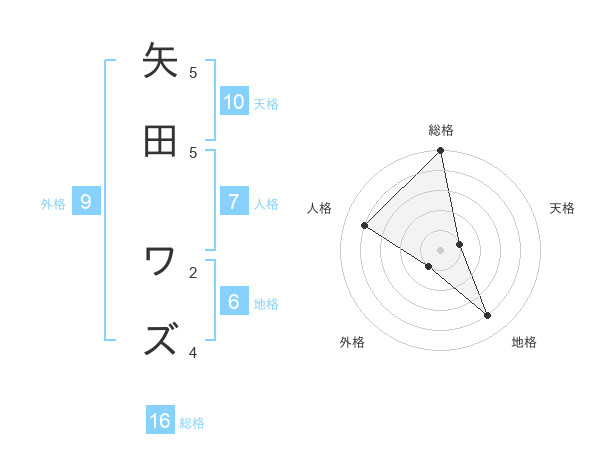 矢田 ワズさんの総格は16画の5点!