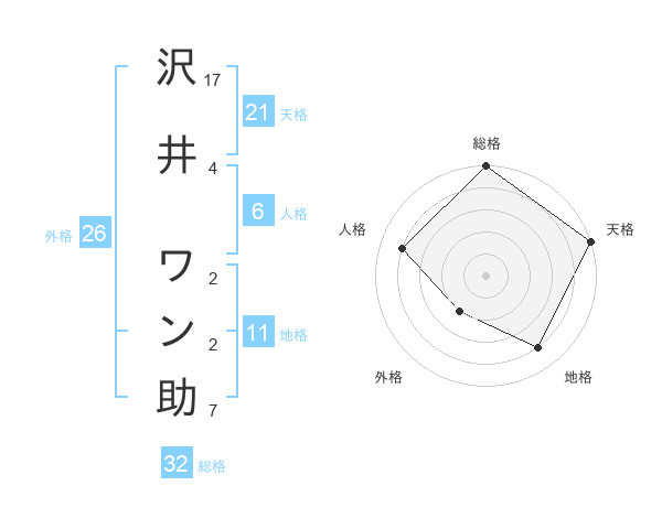 沢井 ワン助さんを姓名の画数から五運を鑑定