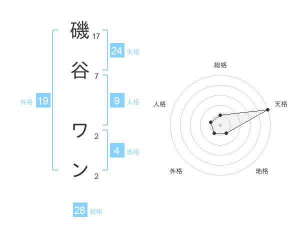磯谷 ワンさんの天格は24画の5点!