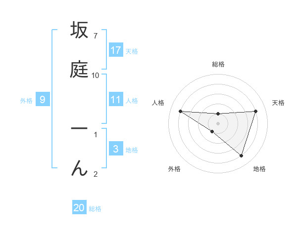 坂庭 ーんさんの総格は20画の1点!