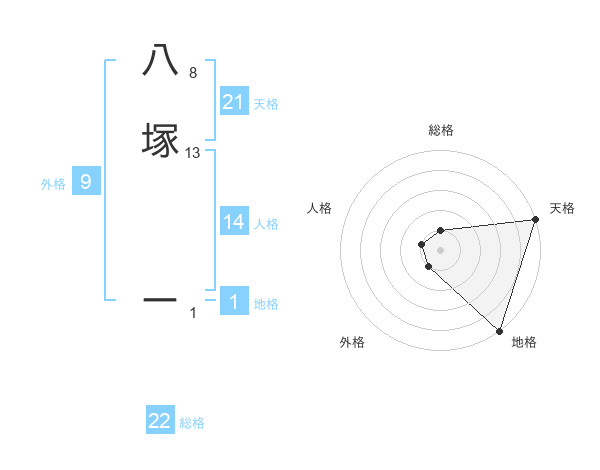 八塚 ーさんの総格は22画の1点!