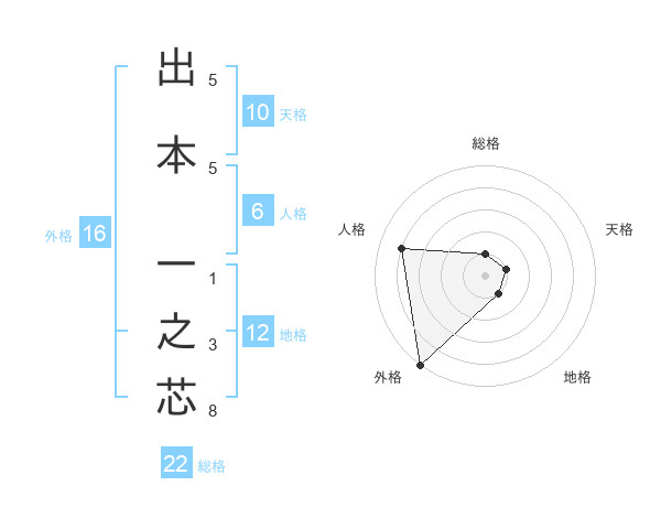 出本 一之芯さんの総格は22画の1点!