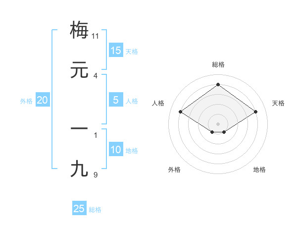 梅元 一九さんの総格は25画の4点!