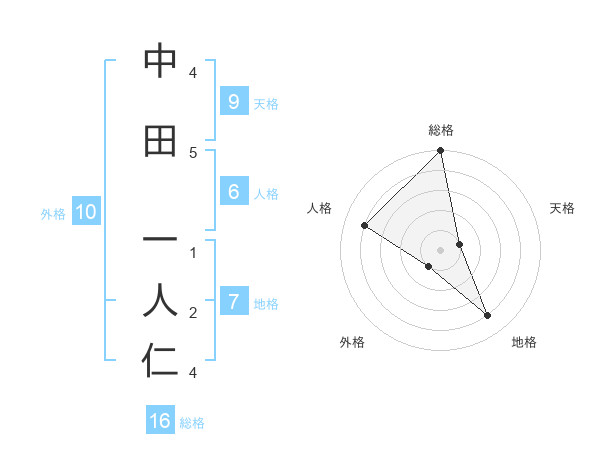中田 一人仁さんの総格は16画の5点