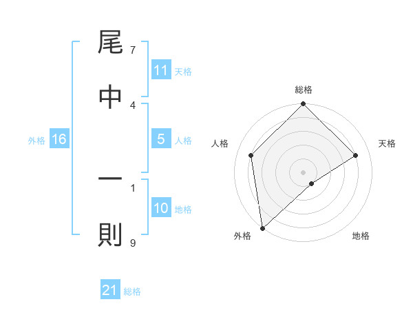 尾中 一則さんの総格は21画の5点!