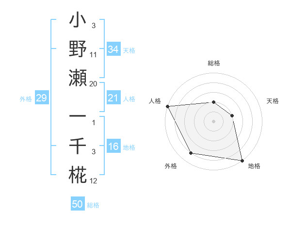 小野瀬 一千椛さんを姓名の画数から五運を鑑定