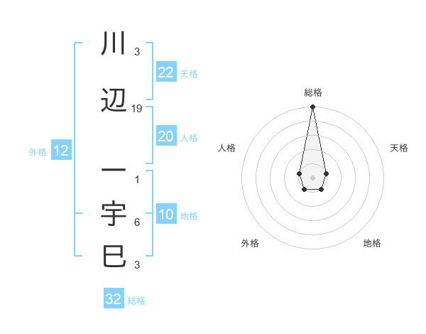 川辺 一宇巳さんの総格は32画の5点!