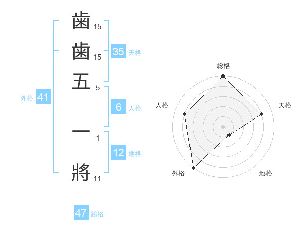 歯歯五 一將さんの総格は47画の5点!