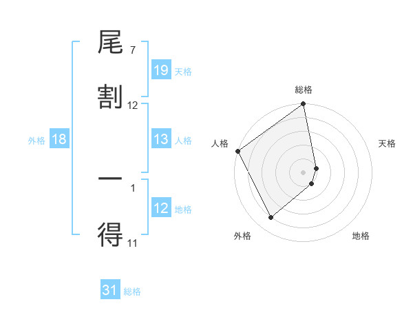 尾割 一得さんの天格は19画の1点!