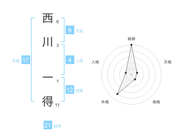 西川 一得さんの総格は21画の5点!