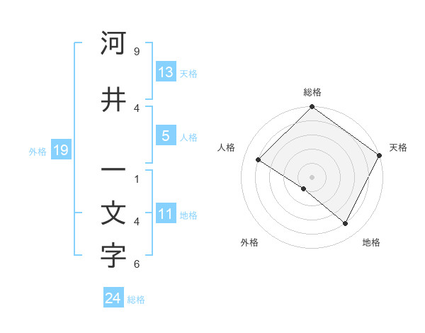 占い結果は姓名判断である以上、良い場合も悪い場合もありますが、決してお名前を誹謗中傷するものでなく、画数の自動計算によって得られたものです。また、本サイトの検索によって得られた鑑定結果で、第三者を誹謗中傷したり名誉を棄損するような行為を禁じます。