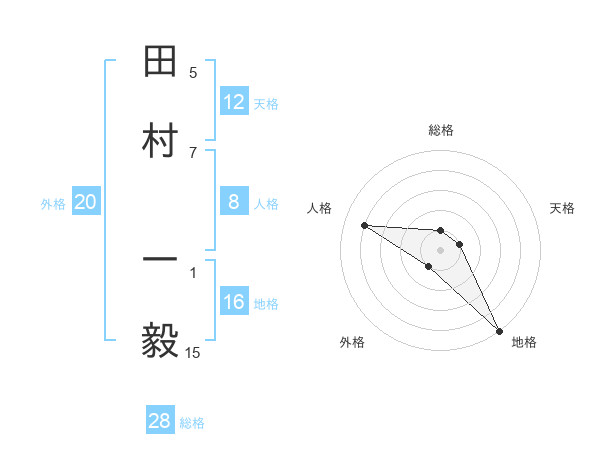 田村 一毅さんの総格は28画の1点!