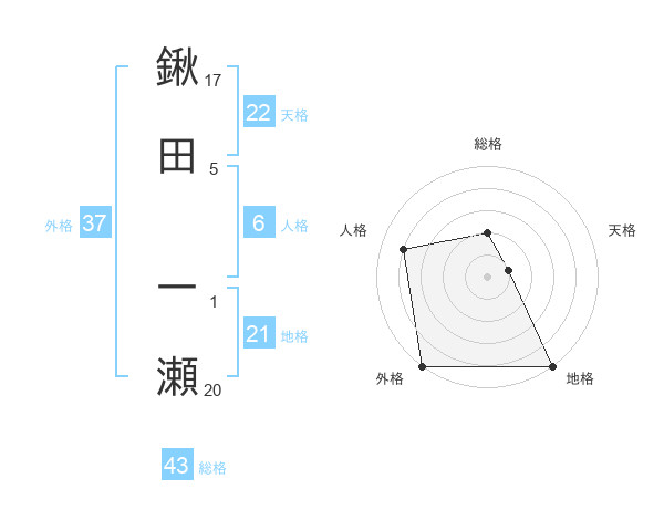 鍬田 一瀬さんの総格は43画の2点!