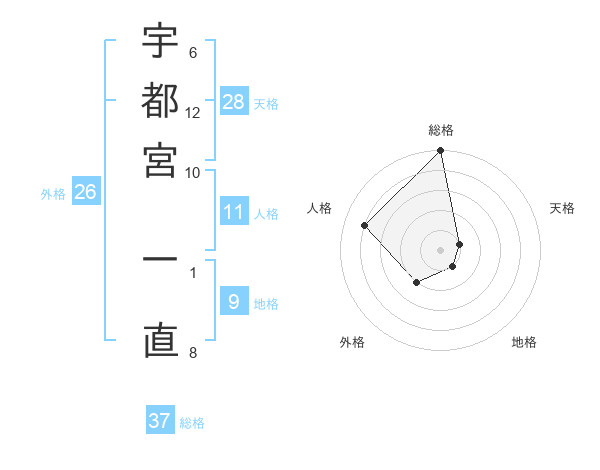 宇都宮 一直さんの総格は37画の5点!
