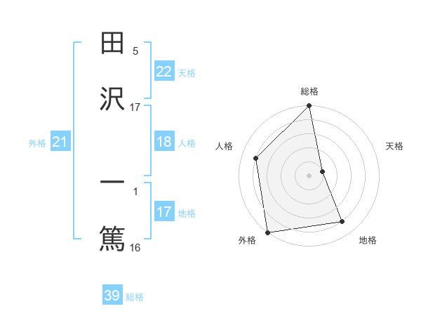 田沢 一篤さんの総格は39画の5点!