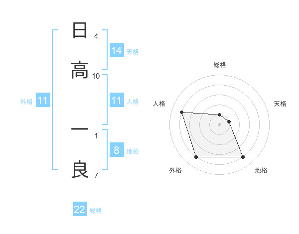 日高 一良さんの総格は22画の1点!