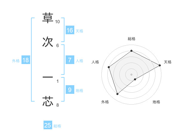 草次 一芯さんの総格は25画の4点!