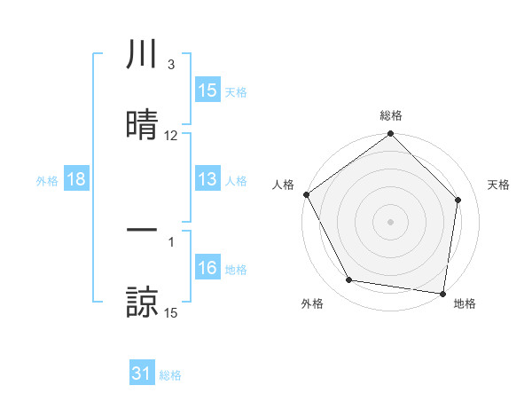 川晴 一諒さんの天格は15画の4点!