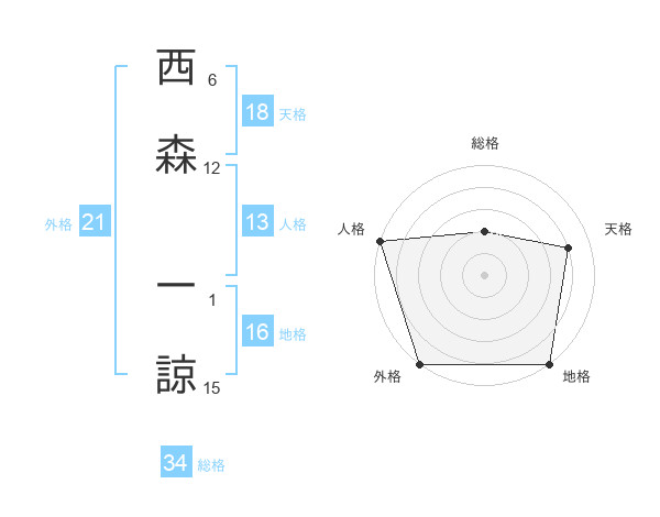 西森 一諒さんの総格は34画の2点!