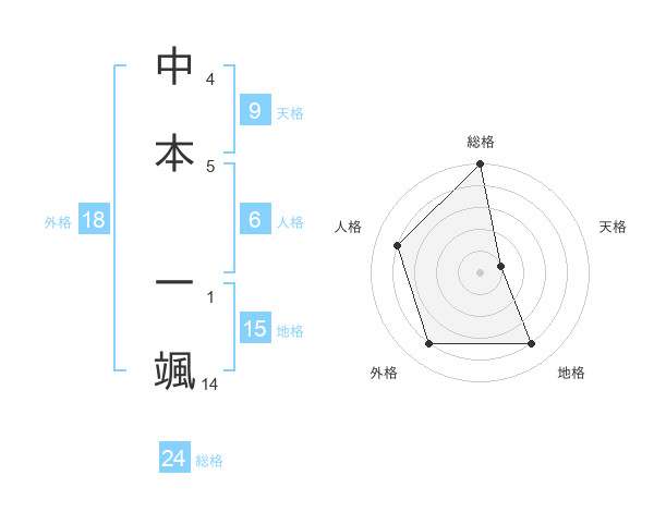 中本 一颯さんの総格は24画の5点!