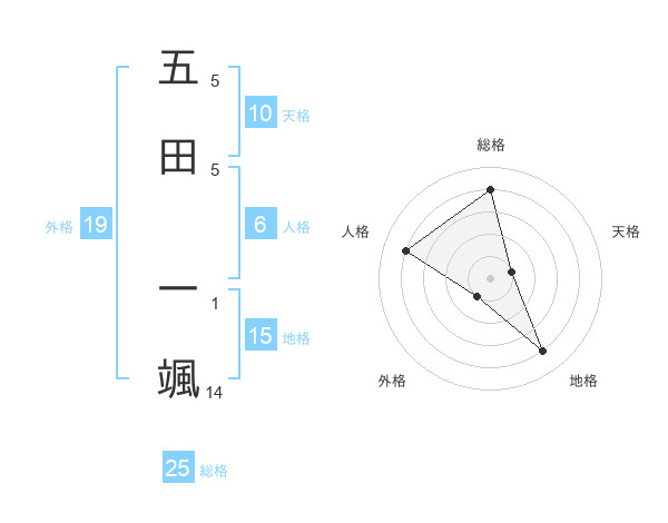 五田 一颯さんの総格は25画の4点!