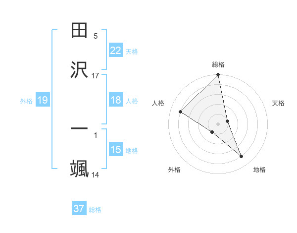 田沢 一颯さんの総格は37画の5点!