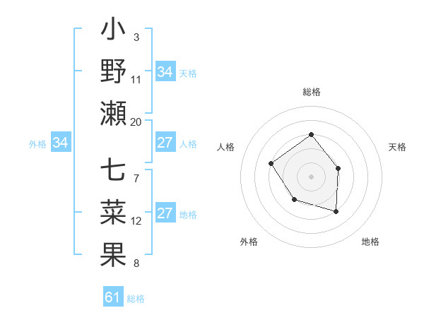 小野瀬 七菜果さんの総格は61画の3点