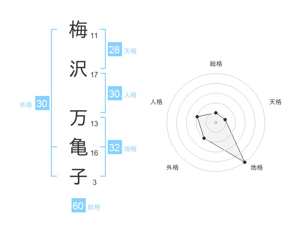 梅沢 万亀子さんを姓名の画数から五運を鑑定