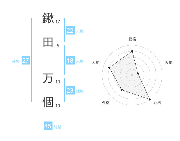鍬田 万個さんの総格は45画の4点!