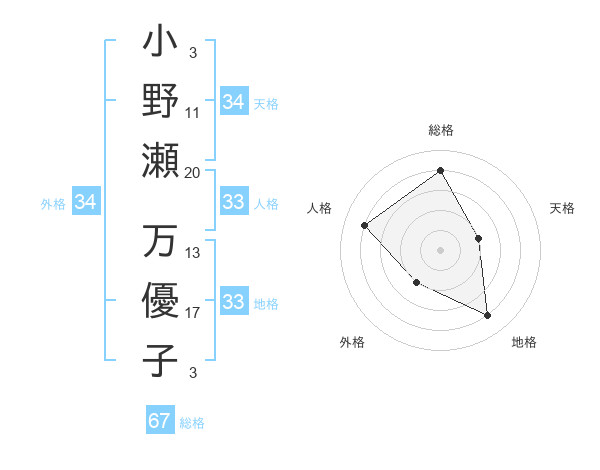 小野瀬 万優子さんを姓名の画数から五運を鑑定