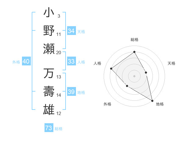 小野瀬 万壽雄さんの総格は73画の4点!
