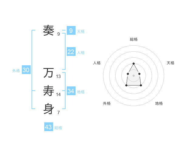 奏 万寿身さんの総格は43画の2点!