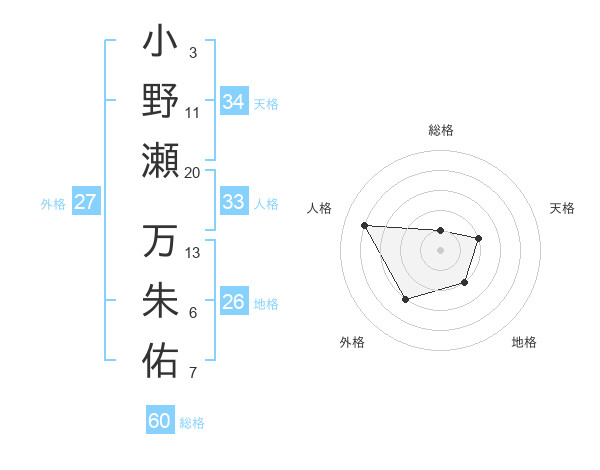 小野瀬 万朱佑さんを姓名の画数から五運を鑑定