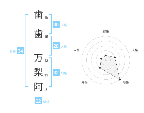 歯歯 万梨阿さんの地格は32画の5点!