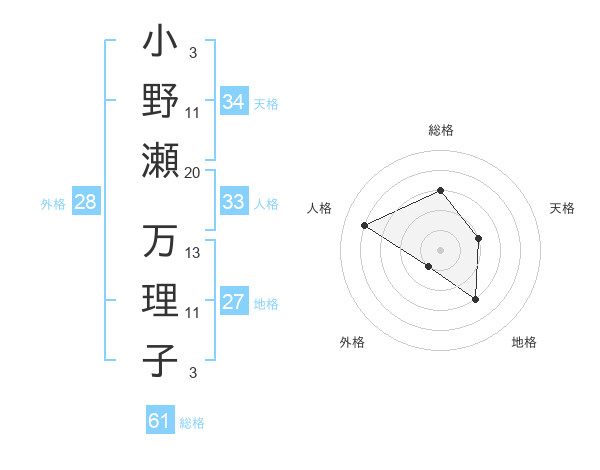 小野瀬 万理子さんの総格は61画の3点!
