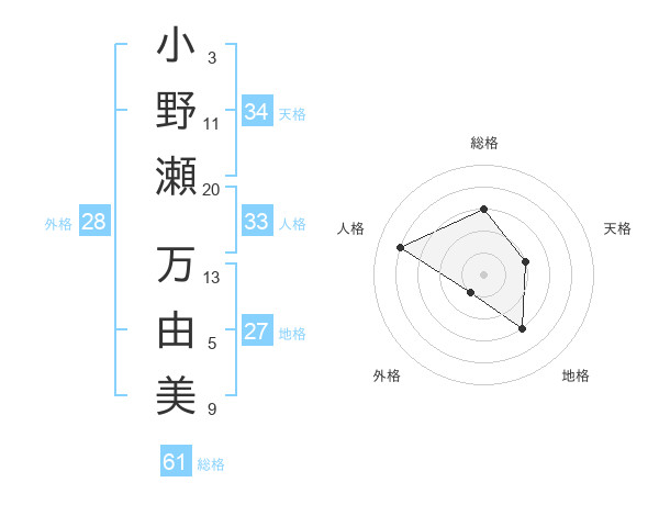 小野瀬 万由美さんを姓名の画数から五運を鑑定