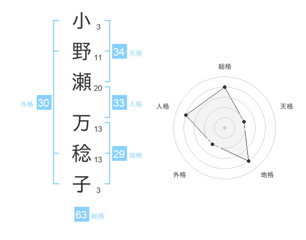 小野瀬 万稔子さんの総格は63画の4点!