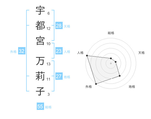 宇都宮 万莉子さんを姓名の画数から五運を鑑定