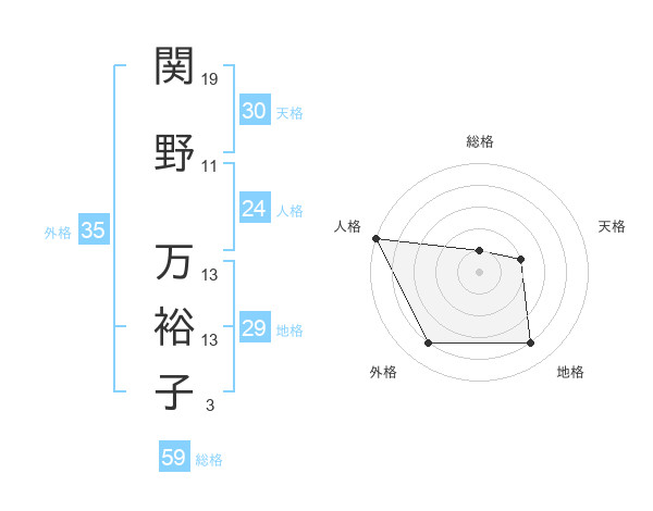 関野 万裕子さんを姓名の画数から五運を鑑定