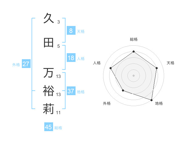 久田 万裕莉さんの総格は45画の4点!
