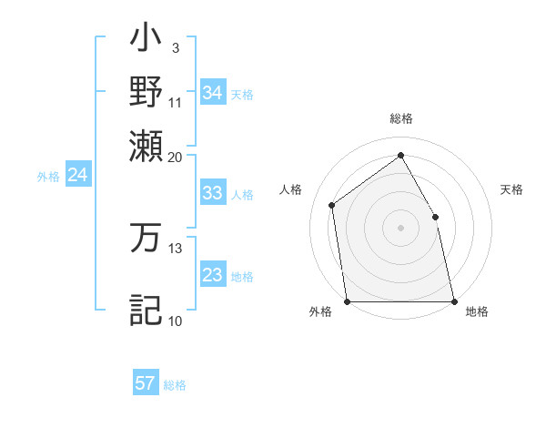 小野瀬 万記さんの総格は57画の4点!