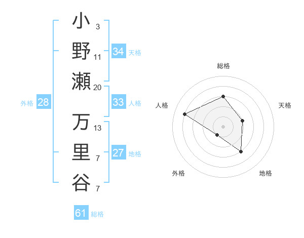 小野瀬 万里谷さんを姓名の画数から五運を鑑定
