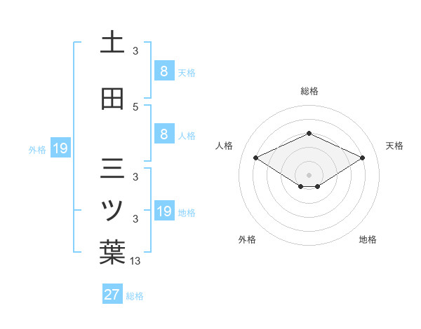 土田 三ツ葉さんを姓名の画数から五運を鑑定