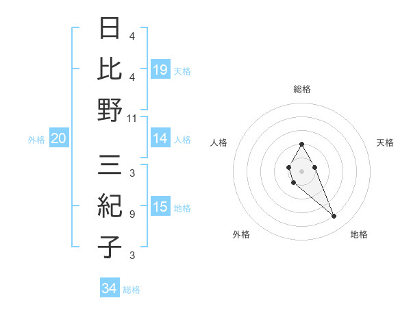 日比野 三紀子さんの総格は34画の2点!