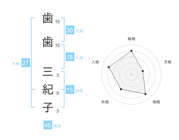 歯歯 三紀子さんの総格は45画の4点!